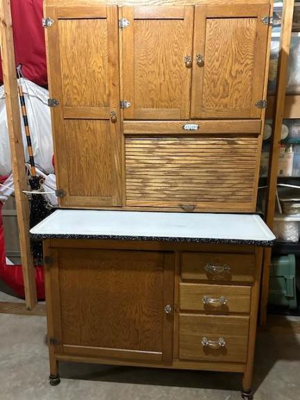 Antiques -- Sellers Hoosier Cabinet; Tall Pine Pie Cupboard; Curio Cabinet; Hickory wood chest of drawers; 1890's Blanket Chest of Drawers; Manual working typewriters;