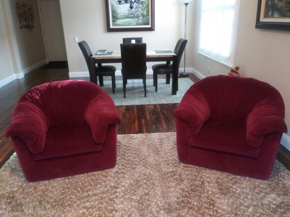 Small but comfortable chairs. Upholstered in plush burgundy fabric. $70 for pair or $40 each.