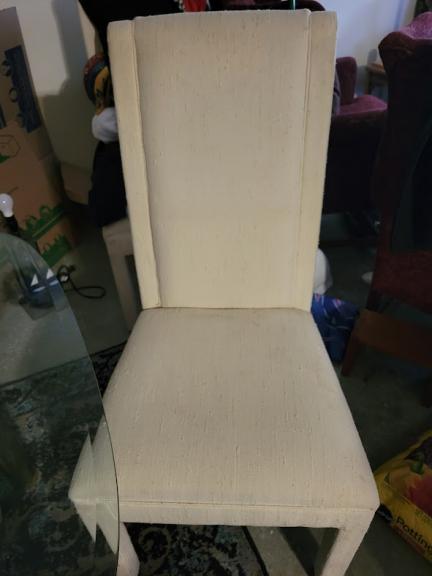 Moving soon, and have to downsize. This table is beautiful. It has a glass top with brass colored legs and stand. It is heavy, and is not a cheap set. The chairs that go with it are high back material covered. There is a very slight chip on one of the sides of the glass, you don't notice it unless you look hard. This requires 2 people to pick up, it's really kinda heavy.