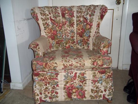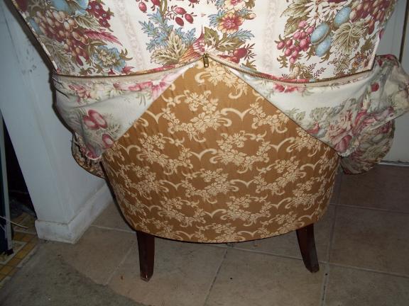 HOWEVER, ALSO NOTE THE LAST PHOTO WHICH SHOWS A ZIPPER STRAIGHT UP THE BACK. THIS CHAIR HAS BEEN OVERLAYED WITH A CUSTOM-FITTED FLOWER COVERING TO MATCH A NEW COUCH WE HAD PURCHASED.