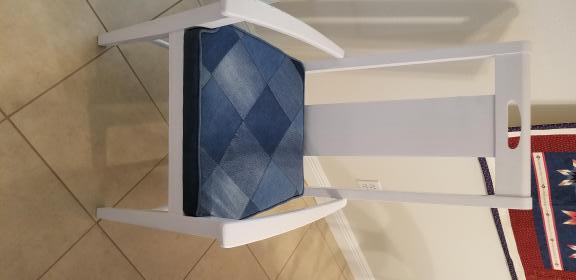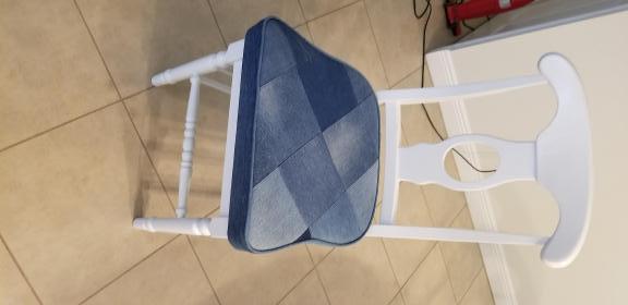 The table in 48" round and 48" x 66" oval when the 18" leaf is in place. The set includes 2 Captain Chairs and 4 regular. All chairs have new quilted seat cushions made from denim. Seats were recovered to allow for grand sons in the 5-9 age range. They wear exceptionally well.
