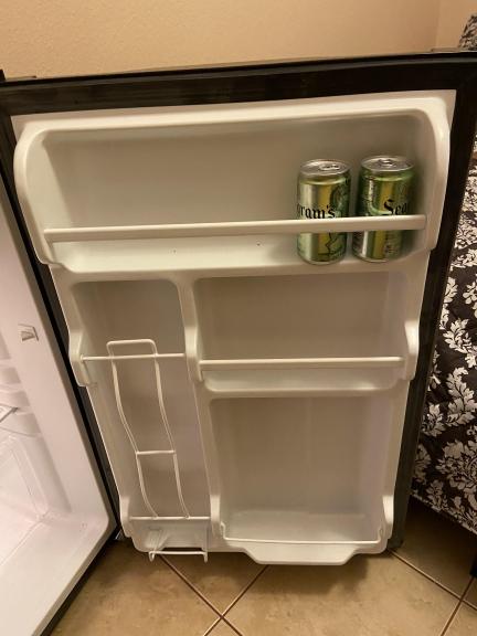 Frigidaire mini fridge. Height 34 inches. 21 inches wide , 23 inches depth Freezer compartment, key to lock included. Glass shelf, separate drawer, side door 3 various side shelves, wire compartment for cans