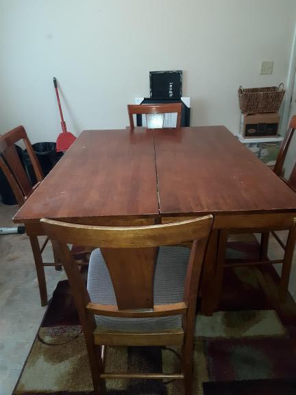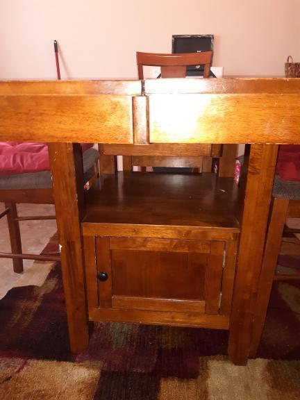 Bar height, solid wood table. Easy expandable section in the middle of the table. Storage cabinet underneath.