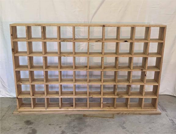 68.5"x42" coffee cup rack. Sixty 6"x6" sections that hold two cups each.
