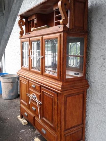 From Huffman Koos - 2 pieces. The top is pictured upside down (sorry about that) but I think you get the idea. It's SOLID OAK, lighted top with beveled glass.. Weighs a lot because of the quality. It's a GORGEOUS piece & I'm heartbroken to let it go. Asking $1000 or Best Offer