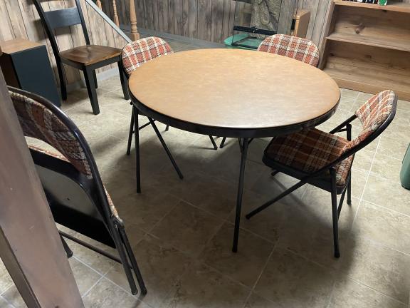 Folding 42” round card table with 4 folding chairs / chairs cloth seat chushions & backs