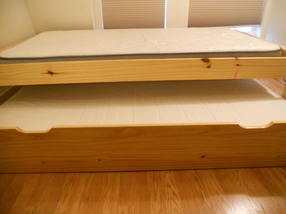 No marks or scratches on wooden frame. Pull out mattress used one time. Great for family visits or kids overnights.