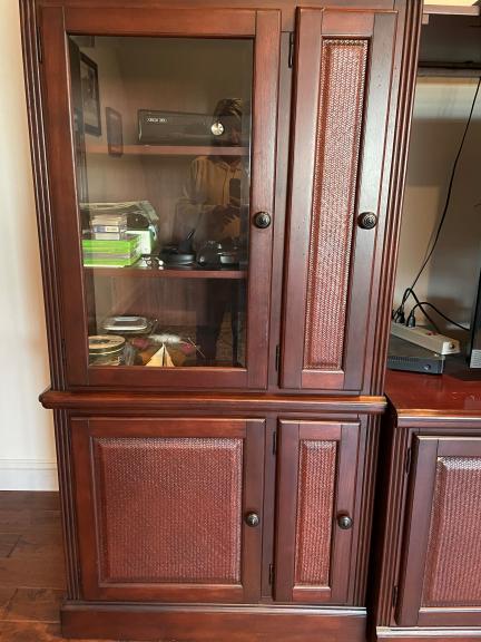 This is a large entertainment center, dark cherry wood, large screen tv opening, lights in the side cabinets with glass doors, lots of storage. For pickup only in Pawling NY.