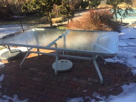 Two outdoor tables. One long rectangular table and one square table. Both have glass/plexi glass tops. Moving. Best offer.