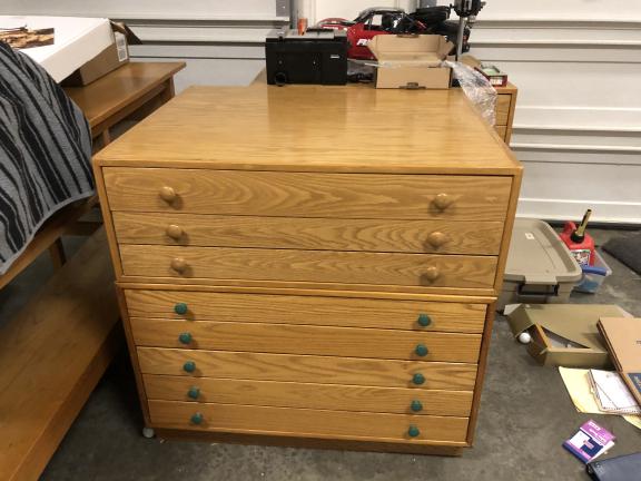 Beautiful Oak drawer cabinet base has rollers for easy moving