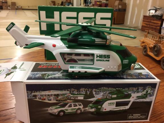 Hess Helicopter and Rescue is one of three Hess releases to feature a non-road vehicle as the primary toy. Its motorized main and tail rotors - activated via either a button on the front side or a switch option on the undercarriage - blur like the real thing. There are high-powered pivoting searchlights, retractable landing gear, and sounds: ignition, takeoff, and flyby. The Rescue vehicle, an SUV has a taut friction motor and retractable emergency roof lights.