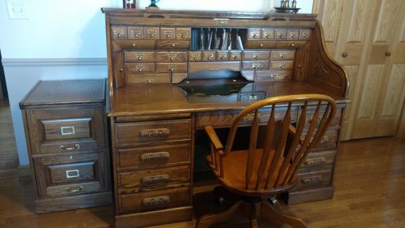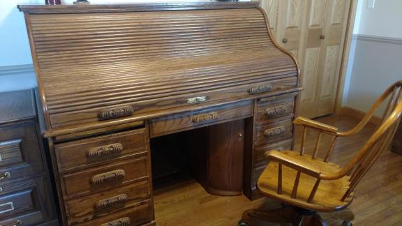 Large roll top desk with printer drawer, key board tray for your computer. Lots of storage and can be securely locked. Down sizing and no longer have room for it. Excellent condition. A beautiful piece. Matching chair included.