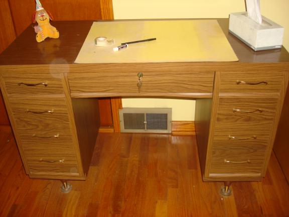 This darker wood desk is great for the person seeking a great deal of storage! Seven drawers plus a locking center drawer allow confidential storage of private papers along with room for many other items. While it looks like there are 8 drawers and a center drawer, two of the drawers meld into one larger drawer to hold longer papers, books, or other larger items.