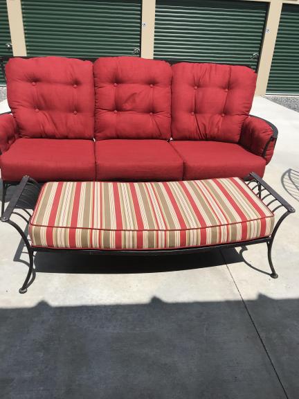 Large wrought iron patio set. Includes sofa, loveseat, 2 chairs, ottoman/table, all cushions and pillows. Heavy set, will not fall apart or rust away. Is a high price set. Very good condition.