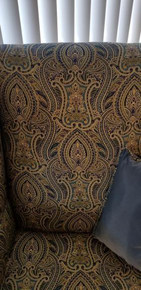 Elegantly recovered wing back chair. Material is a paisely pattern with green gold and blue the primary colors.
