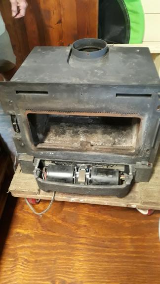 HI 200 Wood Cast Insert by Hampton. We still have Owner's manual. The box is: 17 wide, 8 tall and 10 deep. Handles a 16 inch log well. Works good with a blower, too.