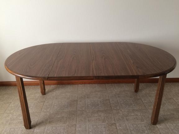 Kitchen table + 2 leaves. Formica top. Measures 41 1/2" Deep x 42" long. (w/out leaves). Leaves are 15"x 30" each. With leaves, table measures 41 1/2" x 72".