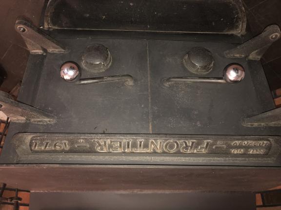 Frontier wood burning stove, piping, fire screen cover, cast iron kettle, coal bucket & shovel, and firebox tools (pocket, etc.)