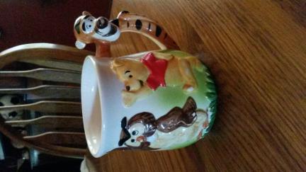 Like new Winnie the Pooh cup with Owl by Winnie and Tigger as the handle. In very good condition. Walt Disney Productions imprinted on bottom of cup.