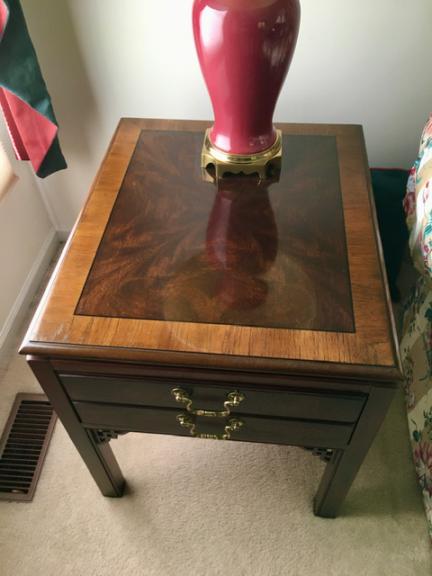 High end living room set made by Drexel. Includes book cabinet, coffee table, round end table and rectangular end table. Best offer will be considered.