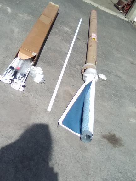 9 FOOT AWNING INCLUDING COMPLETE AWNING SETUP WITH ARMS AND ATTACHING STRIP.