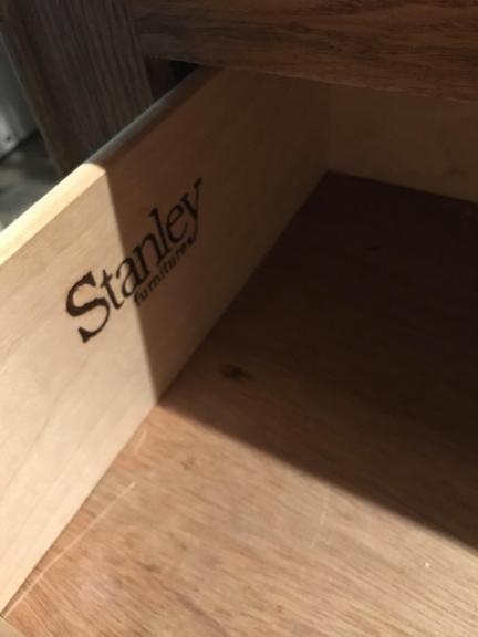 Stanley nightstand is solid wood. Size is 28 wide , 24 inches high and 16 inches deep . Made of solid wood. Drawers work perfectly. Some wear on top .