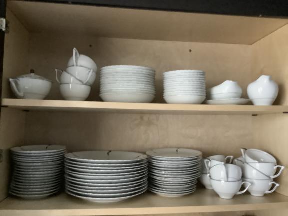 Serving for 12. Gold China named June..cups, saucers, dinner plates, bread plates soup, salad serving pieces..some silver rims damaged by dishwasher