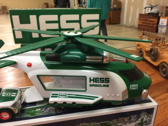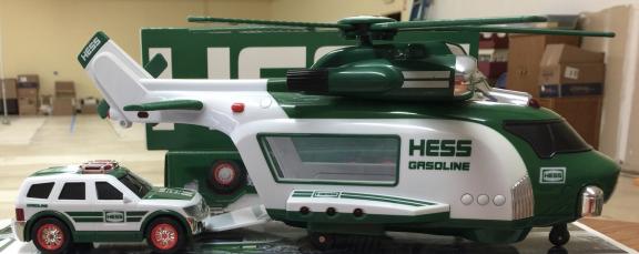 Hess Helicopter and Rescue is one of three Hess releases to feature a non-road vehicle as the primary toy. Its motorized main and tail rotors - activated via either a button on the front side or a switch option on the undercarriage - blur like the real thing. There are high-powered pivoting searchlights, retractable landing gear, and sounds: ignition, takeoff, and flyby. The Rescue vehicle, an SUV has a taut friction motor and retractable emergency roof lights.