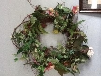 Huge a grapevine wreath filled with assorted greens and some flowers. Can be inside or out