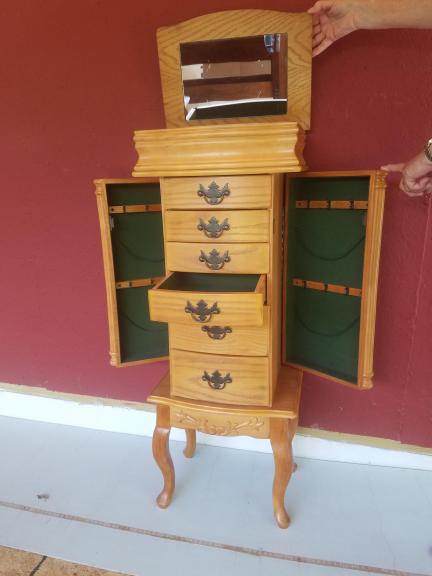 41 in. Tall Jewelry Box. With 6 drawers and 2 side doors. Lift top with mirror.