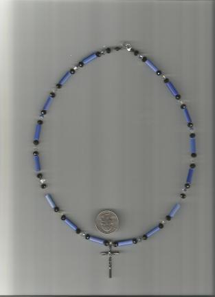 Cross is 30mmx12mm necklace is 22in. long. It is made with black and crystal Swarovski Crystals, blue swiss pressed glass tubes. Clasp and findings are sterling silver.