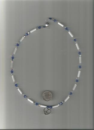 Heart is 20mm necklace is 23in. long. Made with blue sapphire and crystal Swarovski Crystals, white swiss pressed glass tubes. The fastener is a small round magnet.
