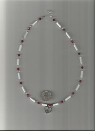 Heart is 20mm and necklace is 23 in. long. It is made with ruby red and crystal Swarovski Crystals, white swiss pressed glass tubes and sterling silver clasp and rings.