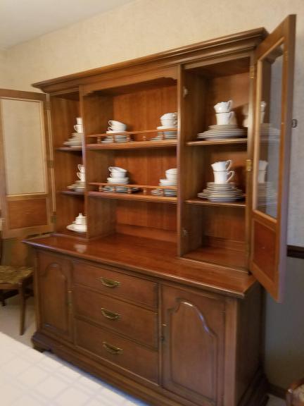 BEAUTIFUL CHERRY DINING ROOM SET, INCLUDES 2 PC HUTCH, TABLE WITH 2 DROP SIDES, 6 CHAIRS, TABLE PADS AND CLOTH COVER.