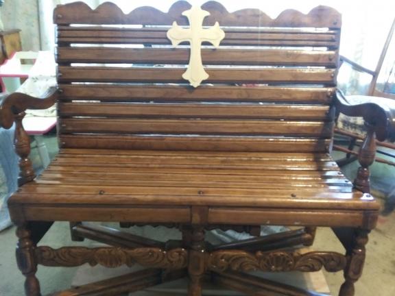 I built this bench in July for a customer who had it built to her specifications this was to sit on her Family plot. so it's smaller than a reg bench it sits 2 people needless to say she was a con artist .So i still have ut its new but it's been antiqued made to look old .