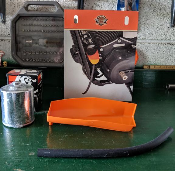 1 nylon strap wrench, 1 metal band strap wrench, 1 plastic oil drain pan, 1 HD Multi Fit Oil Catcher/Drain (unused), 1 K&N Harley Davidson High Performance Filter (part #KN-171C) silver in color (unused). $25.00 for the lot, if interested in individual items, please contact seller.