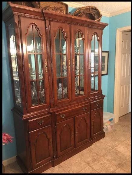 Dining Set includes triple china cabinet and side server, two extension for the table, table protectors for the table and extensions. The extensions have been kept in storage bags designed for them. There are eight chairs, six regular and two Captain's chairs.