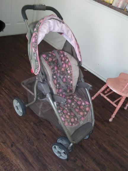 It's a pink an gray baby stroller.