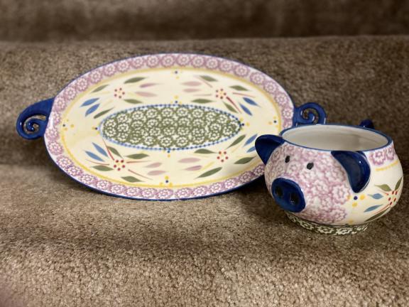 Set of two. Artistically and creative Sandwich plates and bowels. Just think of the fun you two will have while have lunch at your dinning nook. Now chips or damage on this set.