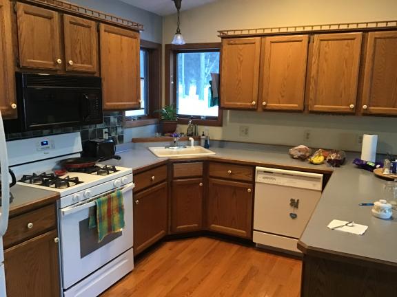 All contents of this kitchen are ready for you (except refrigerator)! Buyer must dismantle kitchen and remove from home. Not available until late April-ish. Cupboards are from Campbell Lumber. Beautiful shape!