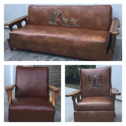 Made in the 1950's this Rare Vintage Sofa and 2 Rockers are in mint condition. It's made of Naugahyde with a Cowboy theme and Wagon Wheel