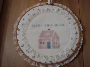 Stamped cloth in an embroidery hoop frame. Lace around the outer edge and a ribbon for hanging. Would fit a country …